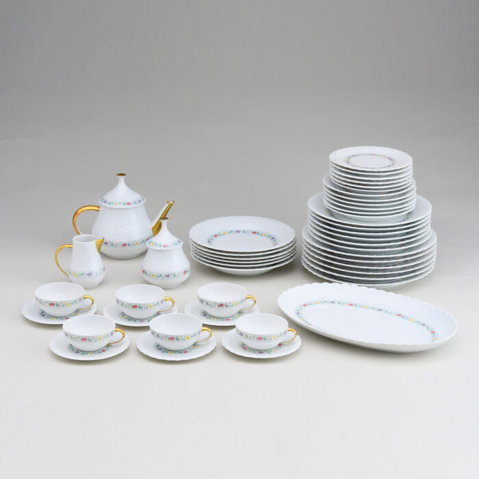 底に商標 カップ6客 高さ4.5×11.5×9.3cm ソーサー6枚 高さ1.7×径14.2cm ティーポット 高さ17.5×21×13cm シュガーポット 高さ14×径10cm ミルクポット 高さ10×10×7.5cm オーバルプレート 高さ4×35.5×33.2cm 大皿6枚 高さ2.5×27.5cm 中皿6枚 高さ2.5×25cm 中小皿6枚 高さ3×22.2cm 皿6枚 高さ1.7×径18.7cm 小皿6枚 高さ1.5×径16.5cm